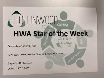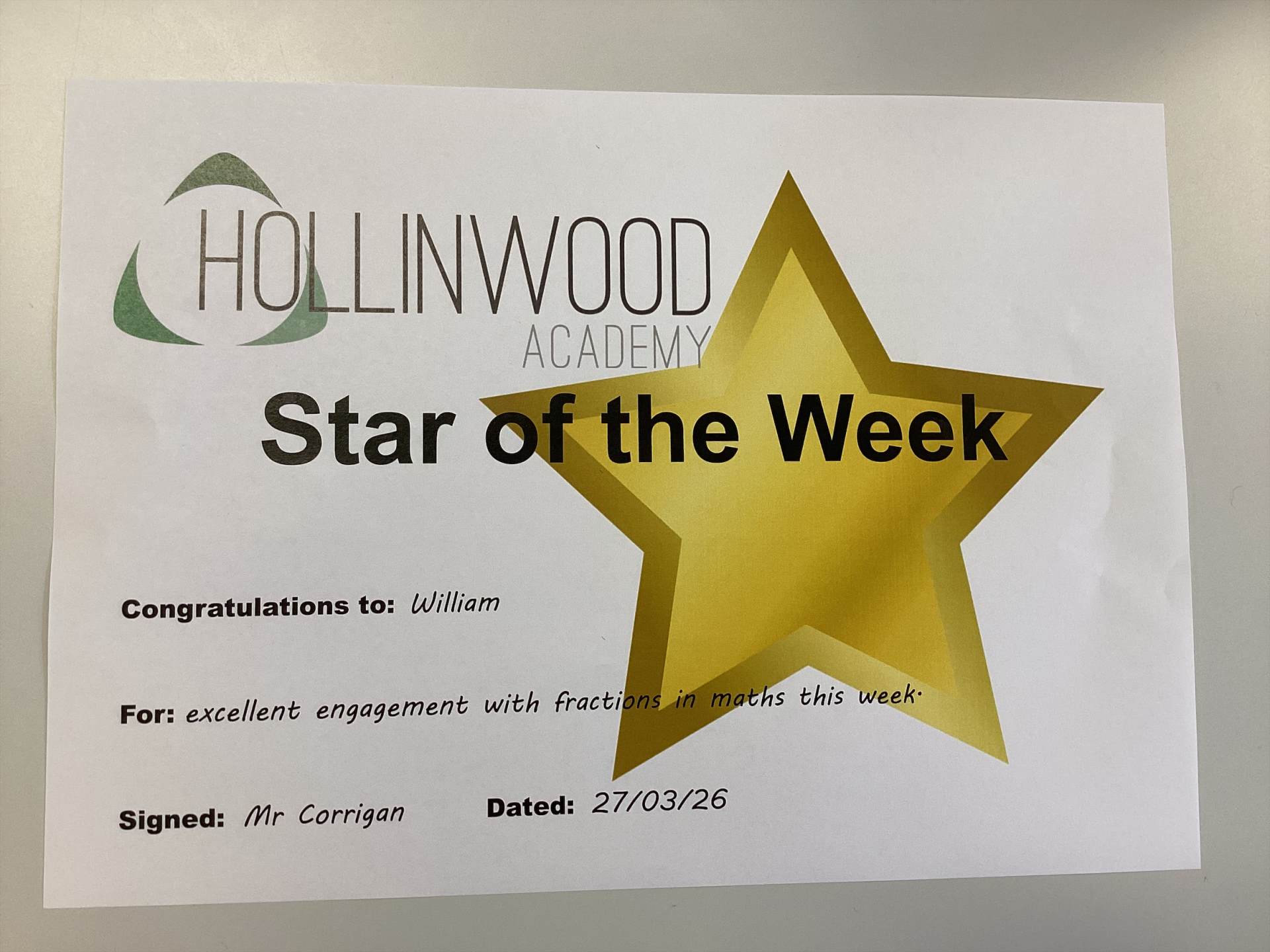 Mr Corrigan’s STAR of the Week is William for excellent engagement with fractions in maths this week.